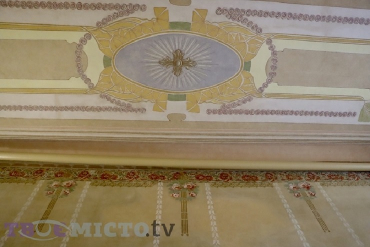 «Головна стеля була в дуже поганому стані – частково під забілом, частково працівники її здерли, була катастрофічно знищена, бракувало елементів. Я не до кінця розуміла, що там має бути намальовано. Допомогло те, що в різних кутках були фрагменти, фактично, збирала зі шматків. Сецесія повторюється в деяких брамах. Тому така реконструкція зібрана з малих клаптиків», – каже Дуткевич.