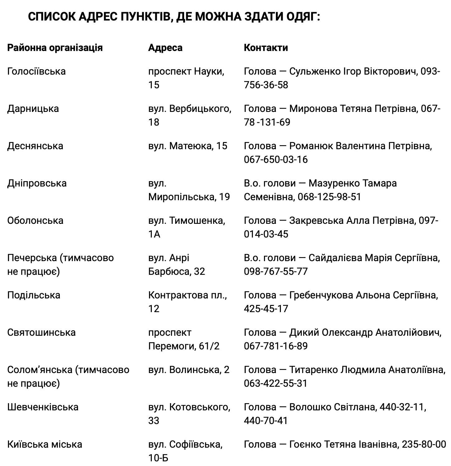 Банки одягу організували у кожному районі Києва (в Солом’янському і Печерському районах пункти тимчасово не працюють), повідомляє Вечірній Київ.