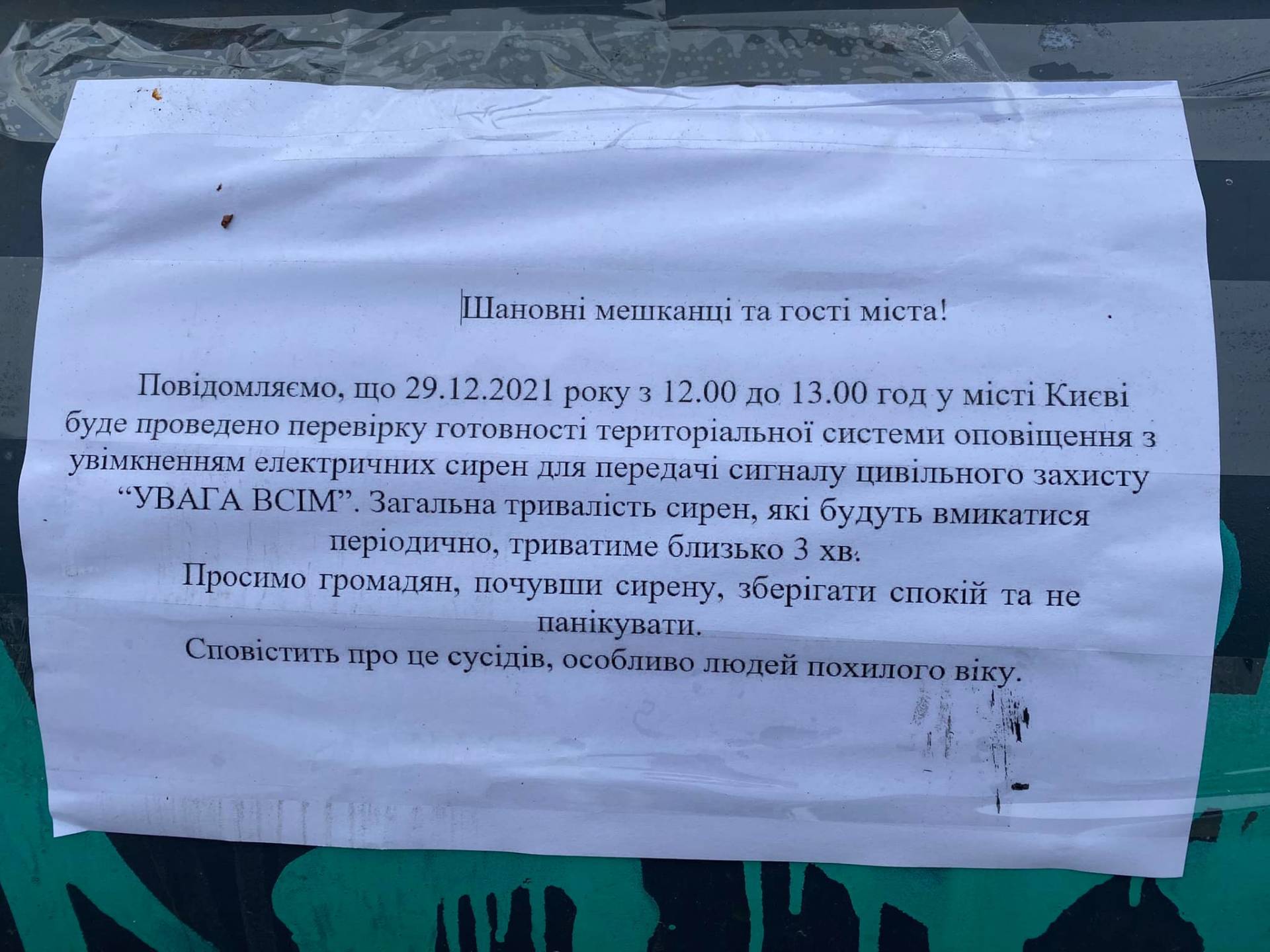 На вулицях і в під’їздах Києва з’явилися оголошення про тестові увімкнення сирен з 12:00 до 13:00 завтра, 29 грудня.