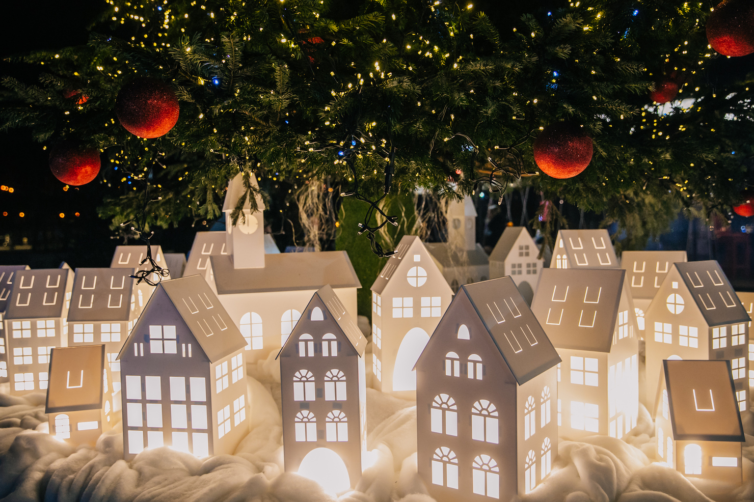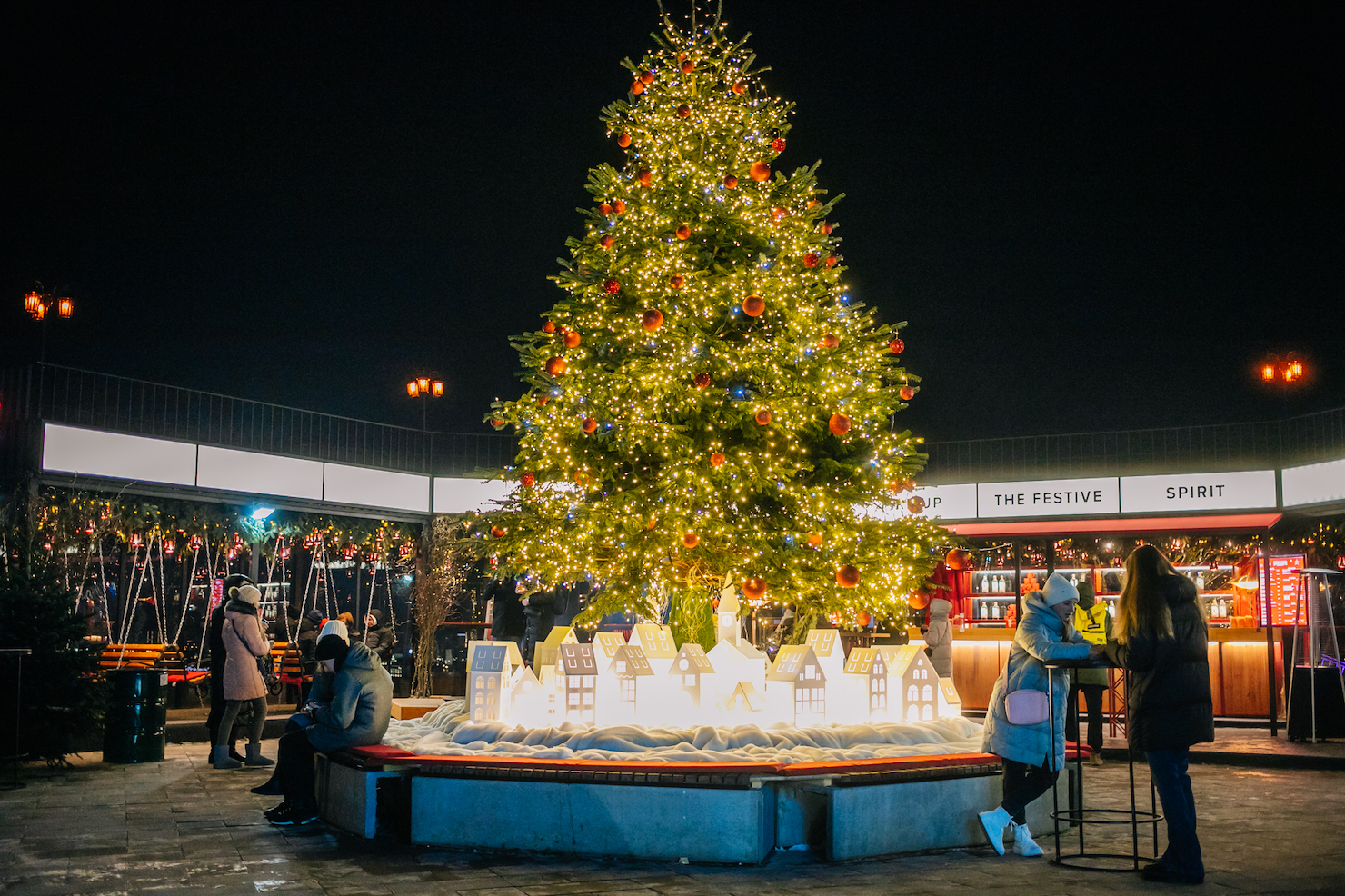 У центрі святкової зони — ялинка. Конструкції навколо захищають простір від поривів вітру, а ще тут можна погрітися біля відкритого вогню.