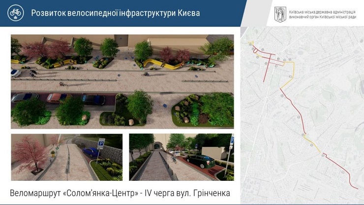 Ця ділянка поєднається у мережу із вже наявною велосипедною інфраструктурою: двосторонньою велодоріжкою на вулиці Прорізна, велосмугою та велодоріжкою на вулиці Пушкінська та запроєктованою велодоріжкою на вулиці Хрещатик та Майдані Незалежності.