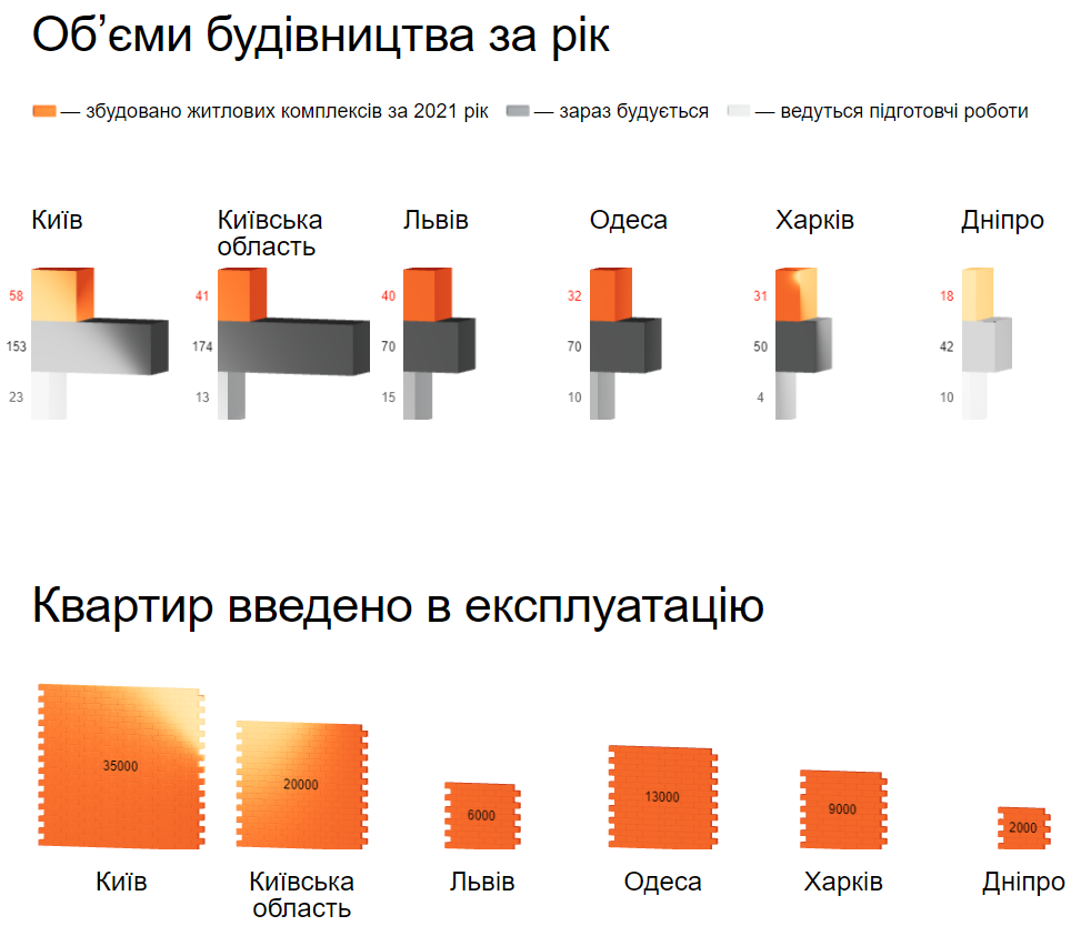 Найбільше житла в минулому році будували в Києві та області – 153 та 174 проєктів відповідно. Найменше у Дніпрі – 42. Знову ж таки, найбільше квартир введено в експлуатацію у Києві та області – 35 тисяч та 20 тисяч.