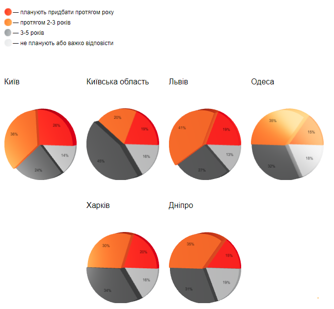 Серед тих, хто цікавився темою новобудов за останні три місяці, у Києві планують купувати квартиру протягом року 26% опитуваних, 36% – протягом двох-трьох років.