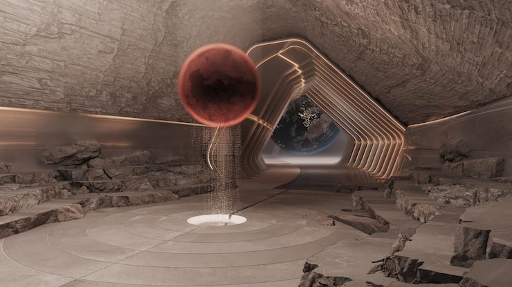 За словами Махна, інтер’єри поєднують два світи — марсіанський і земний. Так, піщані бурі Марсу надихнули на вибір кольорової гами.