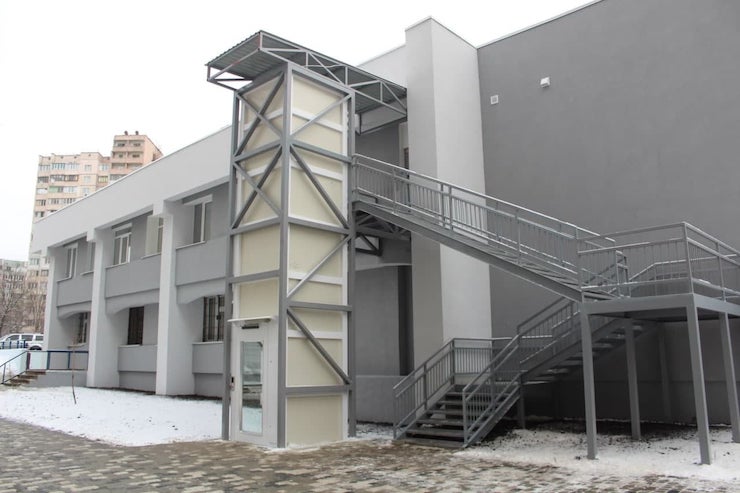 Зовнішній ліфт доступний лише з вулиці. Щоб потрапити з другого на перший поверх, потрібно вийти з приміщення на ліфтовий майданчик, спуститись вниз і обійти будівлю.