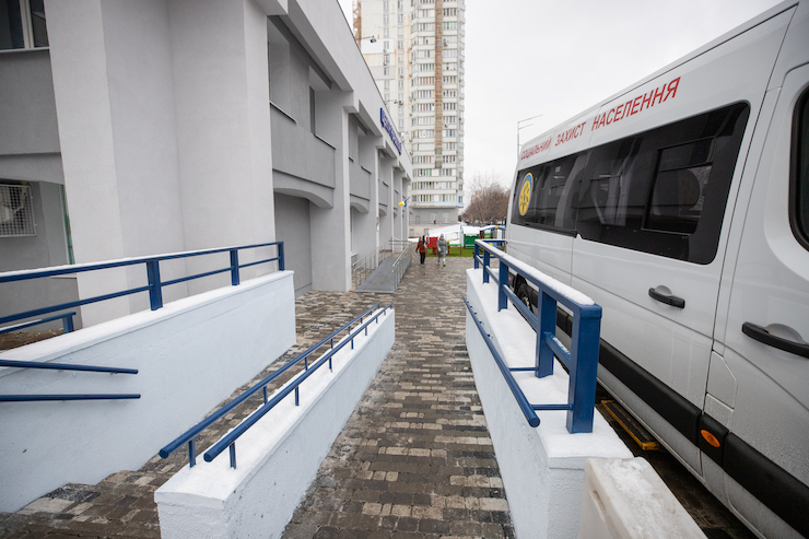 Безбар’єрність території: киянин Олександр Стадніченко, який пересувається на колісному кріслі, зазначає, що один вихід з території центру веде просто на проїжджу частину, а інший — це «пандус» зі сходинками. Далі до головного входу приставили металічний пандус замість стаціонарного бетонного.