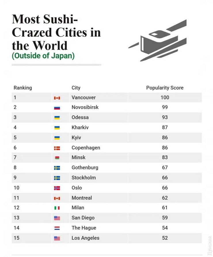 Серед міст перше та друге місця займають канадський Ванкувер та російський Новосибірськ. У Ванкувері є більше 600 тематичних закладів, а в українських містах суші – одна з найпопулярніших страв на виніс.