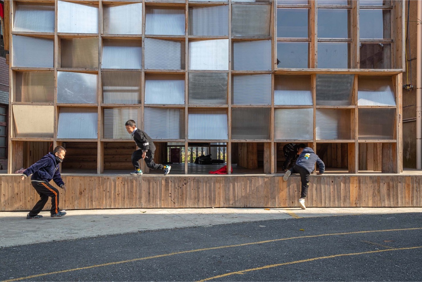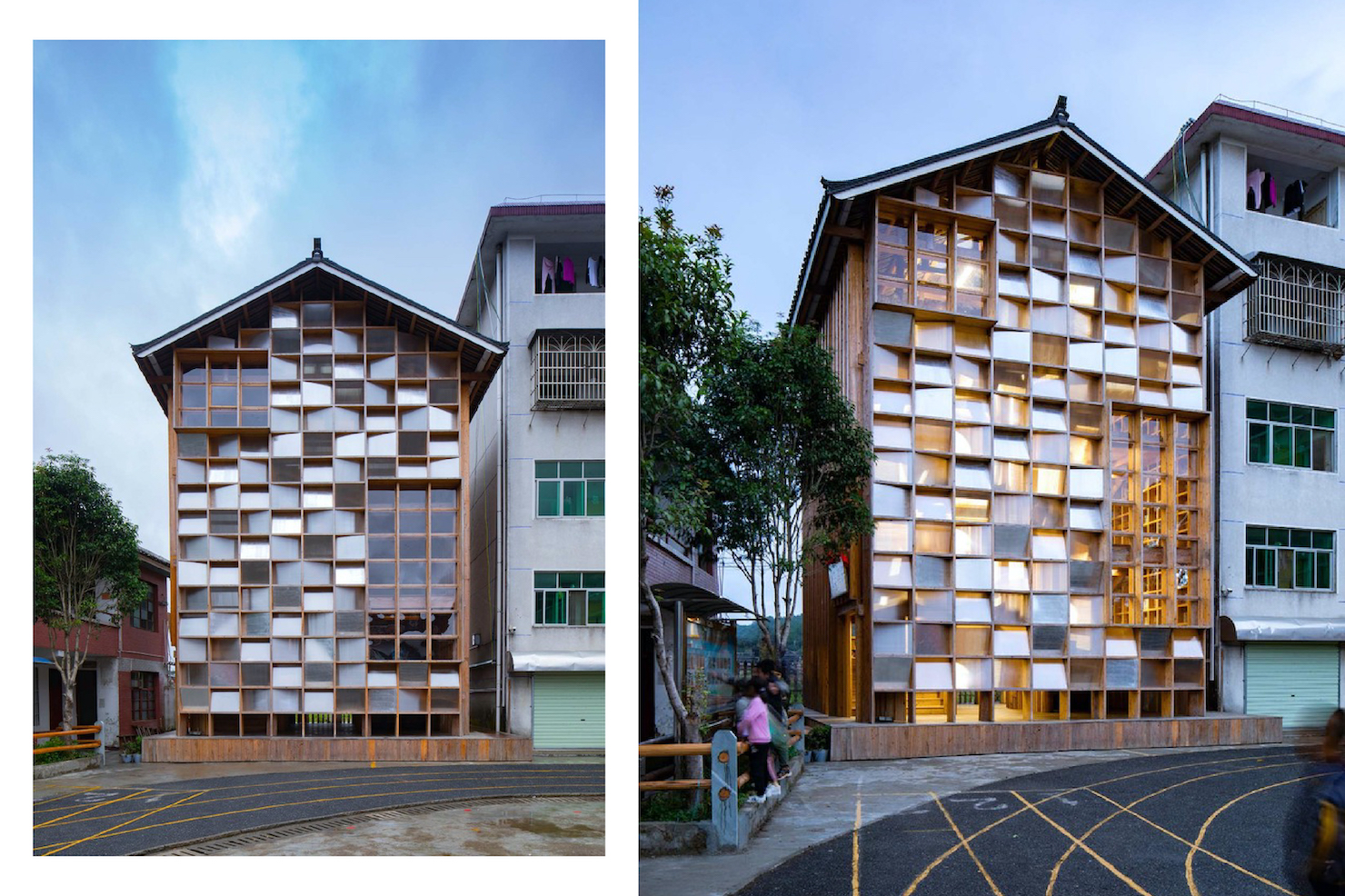 Архітектурне бюро Condition_Lab вирішило додати до шкільного комплексу споруду, яка б мала сучасний фасад і водночас наслідувала принципи традиційного будівництва. За основу проєктувальники взяли дерев’яний каркасний будинок.
