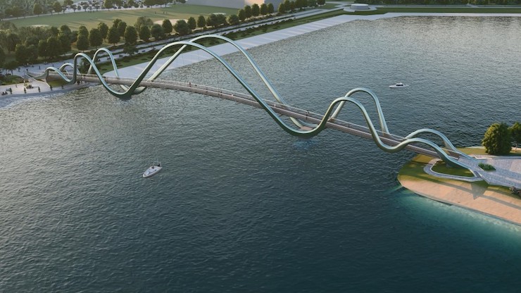 Острів з Оболонською набережною сполучатиме пішохідний міст, який почали будувати восени 2020 року. Через специфічну форму, яку розробляла компанія Андрія Миргородського, кияни прозвали його «міст-глист».