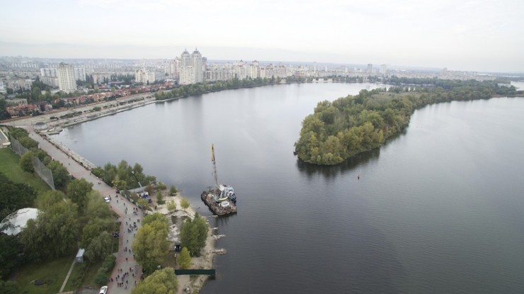 КМДА зазначає, що можливість завезти на острів будівельну техніку з’явилася завдяки спорудженню технологічного містка через затоку.