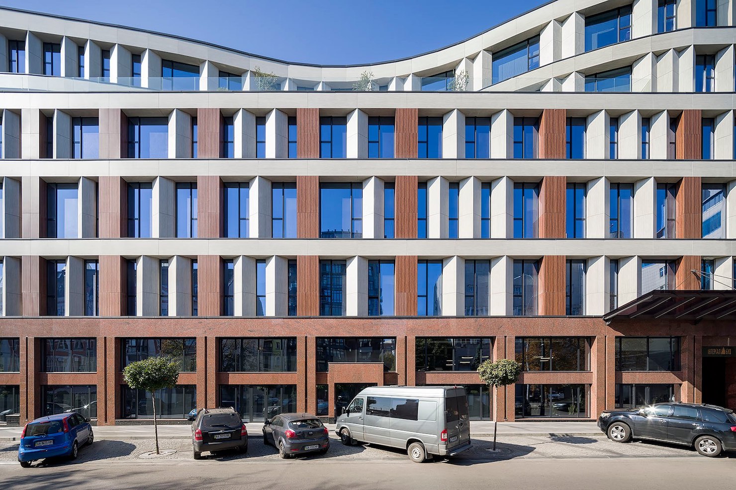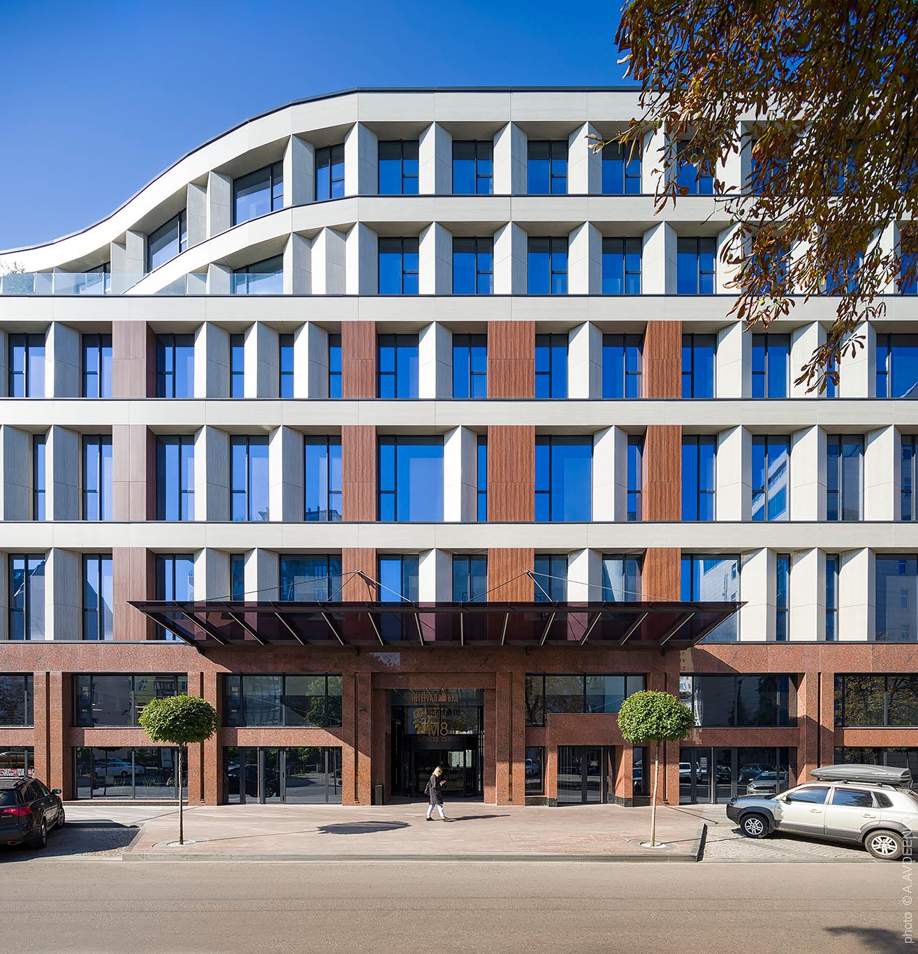 В оздобленні фасаду використали темно-бордові пілястри, які продовжують автентичну стилобатну частину з червоного граніту.