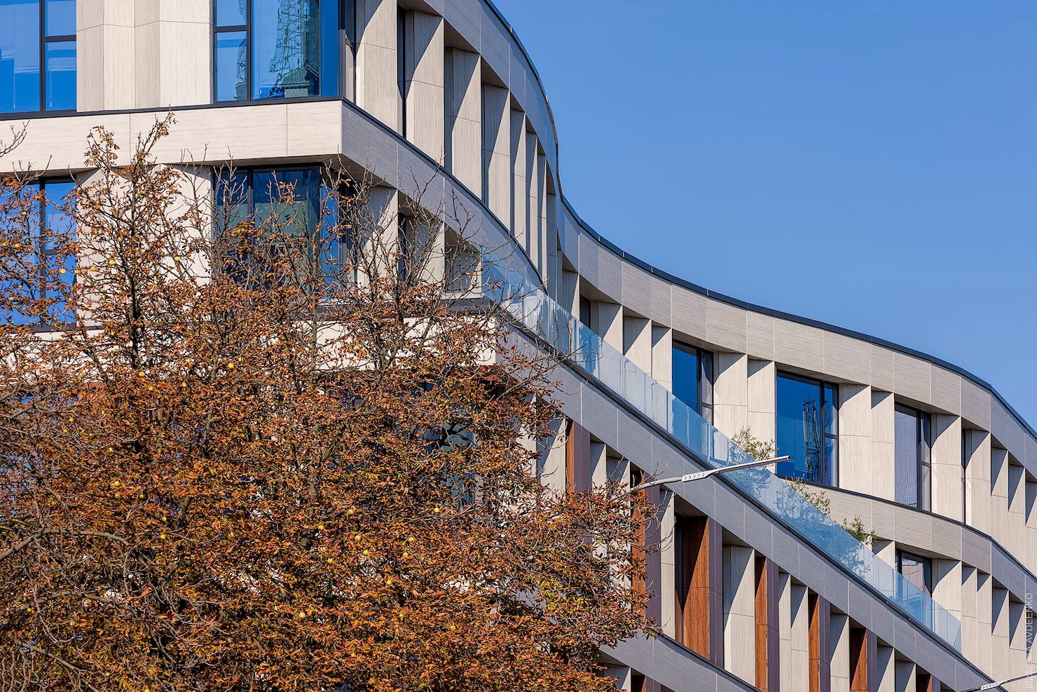 Два добудовані поверхи, вигнуті хвилею, дещо відступають від лінії головного фасаду.