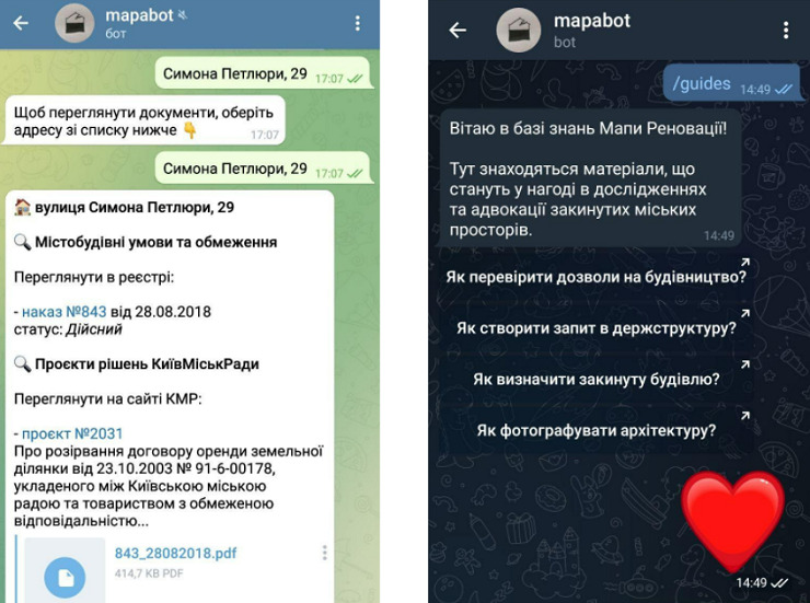 Сервіс об’єднує інформацію про київські будівлі, зібрану волонтерами Мапи Реновації. Також користувач зможе й сам запропонувати будівлю, яка знаходиться в небезпеці. За допомогою бота можна перевірити дозвільну документацію на будівництво, дізнатися договори оренди чи актуальні рішення Київради, моніторити стан та дозволи по різних будівлях. Крім того, бот сам повідомлятиме, якщо раптом зміниться цільове призначення ділянки чи забудовник отримає дозвіл на проведення демонтажних робіт.