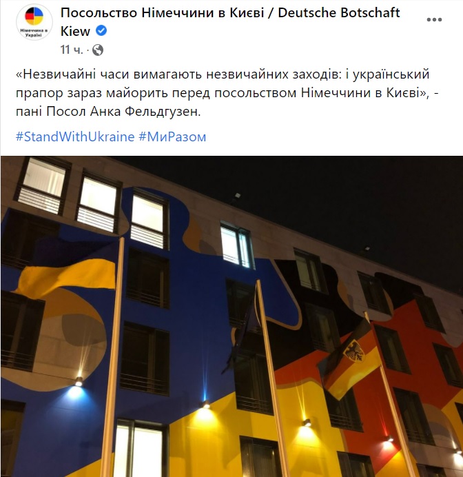«Незвичайні часи вимагають незвичайних заходів: і український прапор зараз майорить перед посольством Німеччини в Києві», – прокоментувала пані посол Анка Фельдгузен. Користувачі Фейсбуку висміяли таку «рішучу та потужну» підтримку.