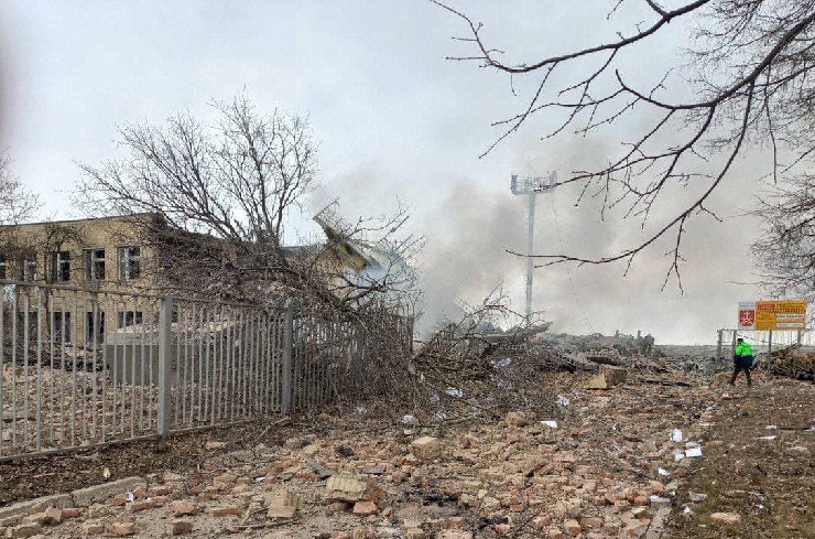 У ДСНС повідомили, що внаслідок ракетного обстрілу виникла пожежа складу на площі близько тисячі квадратних метрів та частково зруйновано адмінбудівлю. З-під завалів деблоковано чотири людини, з них одна загинула.