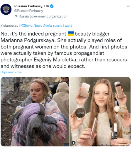 Російське посольство у Великій Британії заявило, що фотографії — постановчі. Цю заяву аргументували тим, що Маріанна Підгурська — б’юті-блогерка. В інстаграмі Маріанни з’явилися десятки образливих коментарів зі звинуваченнями в тому, що вона нібито «зіграла роль» вагітної пацієнтки пологового.