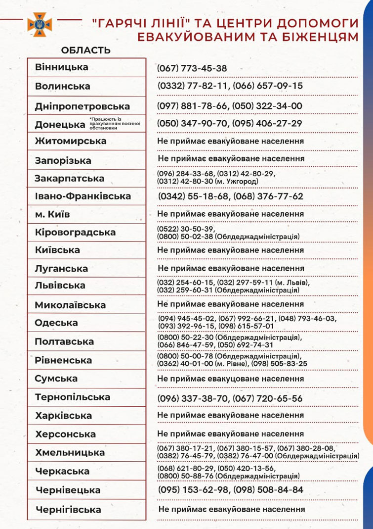 Гарячі лінії та центри допомоги евакуйованим по областях: