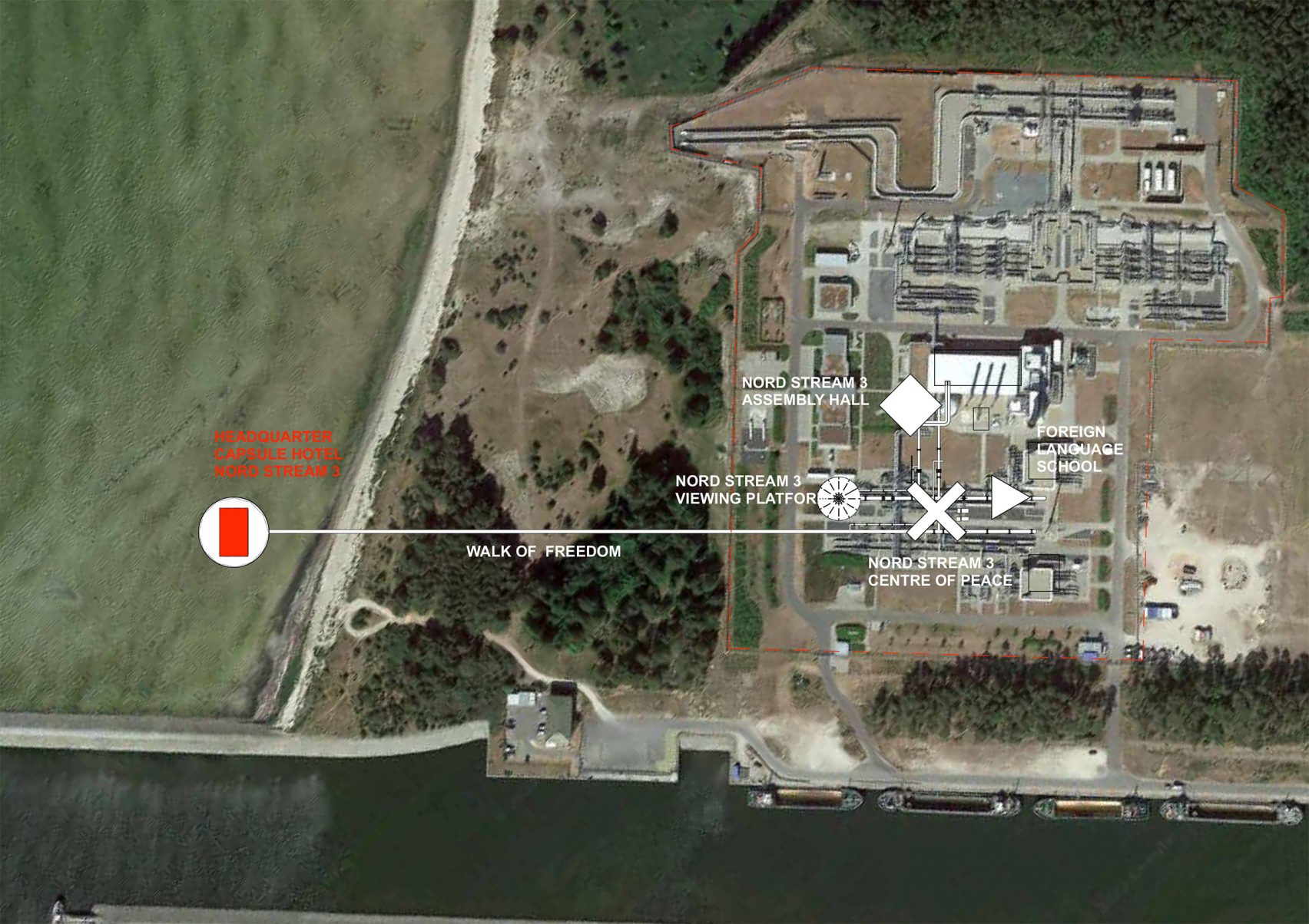 Об’єкти будуть повністю побудовані з матеріалів проєкту «Північний потік-2», включаючи труби довжиною 400 метрів. Труби пропонують перетворити на спальні відсіки в капсульному готелі, схожому на гуртожиток. У Opposite Office розробили проєкт, щоб «спонукати європейські країни відмовитися від залежності від російського викопного палива».