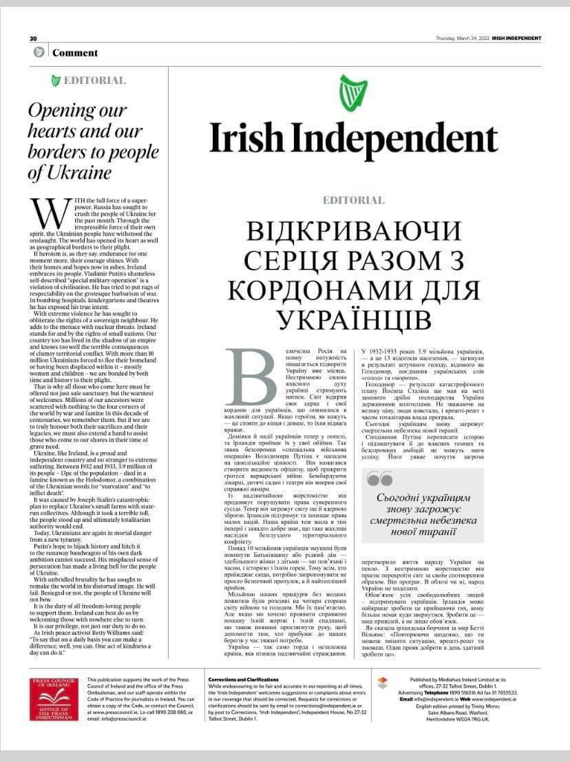 Найпопулярніша газета Ірландії Irish Independent надрукувала редакційну статтю українською мовою.