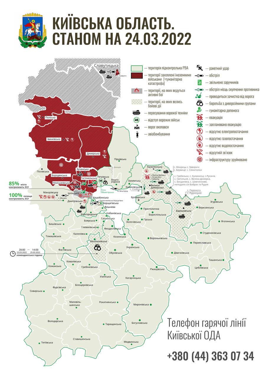 У Вишгородському районі ворог впритул наблизився до Славутича, місто в ізоляції. У Броварському районі сили оборони проводять успішну оборонну операцію. У Фастівському районі виникла пожежа внаслідок ракетного удару — обстріляли нафтобазу в Калинівці.