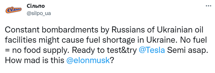 Мережа супермаркетів «Сільпо» у Твітері звернулась до гендиректора Tesla та SpaceX Ілона Маска із проханням надати їй електровантажівки Semi.