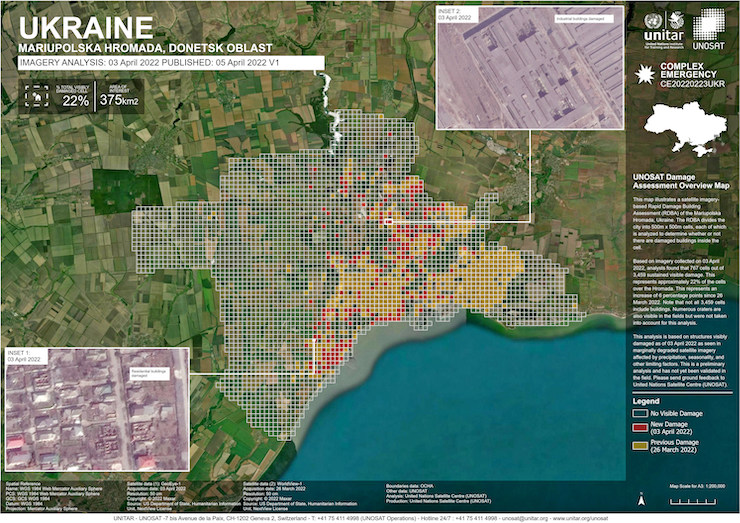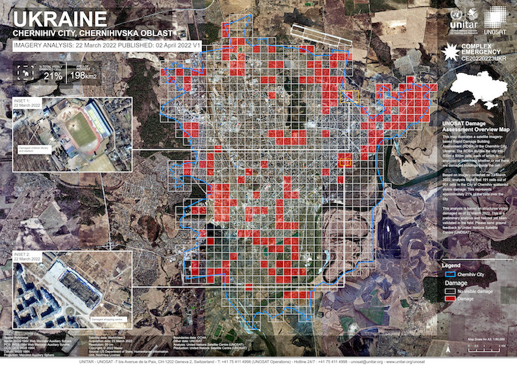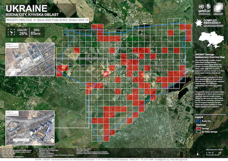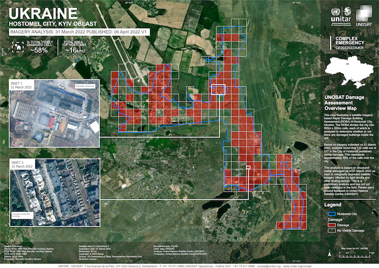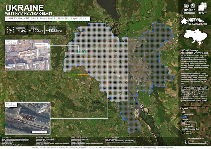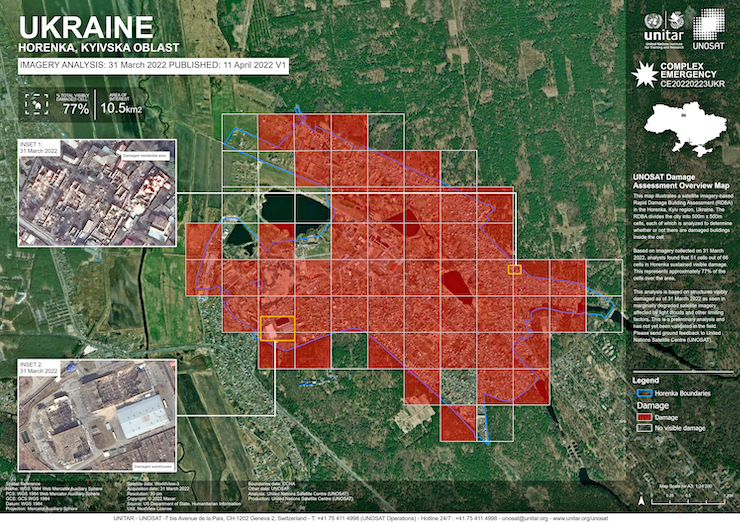 Село Горенка знищено на 78%, а Ірпінь — на 71%, згідно з картами, опублікованими Супутниковим центром ООН.