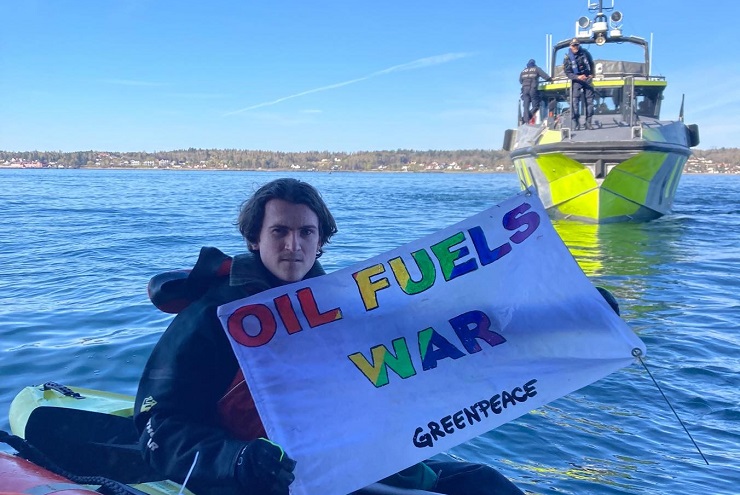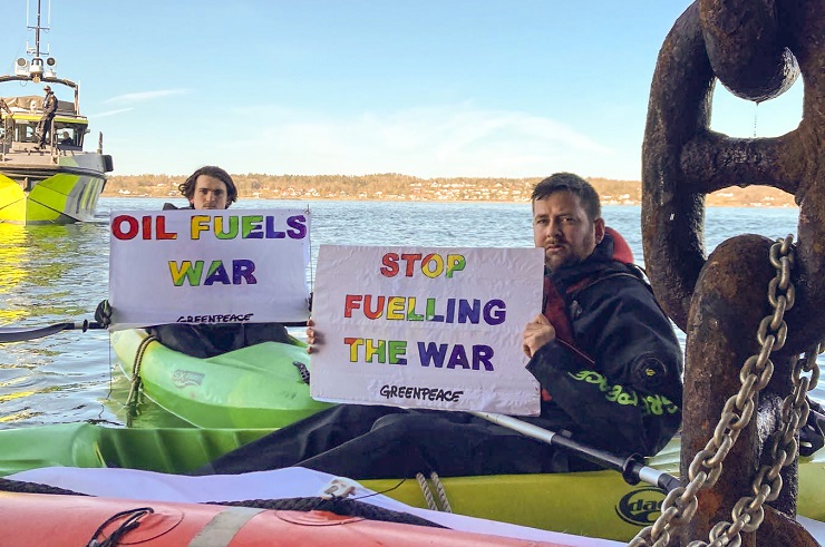 Активісти на байдарках та човнах блокують нафтовий танкер, не даючи йому вивантажити в порт тисячі тонн російської нафти. Мирна акція проходить в нафтовому порту Slagentangen, що належить Esso, норвезькій дочірній компанії американської ExxonMobil. Активісти закликають уряд Норвегії заборонити імпорт російського викопного палива та вимагають, щоб Esso розірвала свої контракти на торгівлю з РФ під час війни.