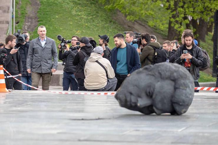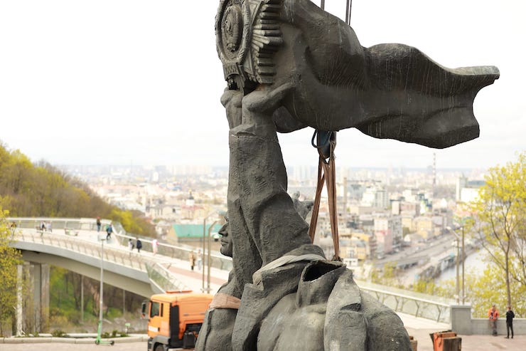 У Києві почався демонтаж скульптурної композиції під Аркою дружби народів, що зображає двох робітників — українця та росіянина. Під час демонтажу в росіянина відвалилася голова.