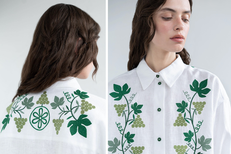 Вишивка на сорочці зображає квітучий виноград, який зрізав минулого літа забудовник. На спині можна помітити візерунок у формі квітки, символ фасаду будівлі.