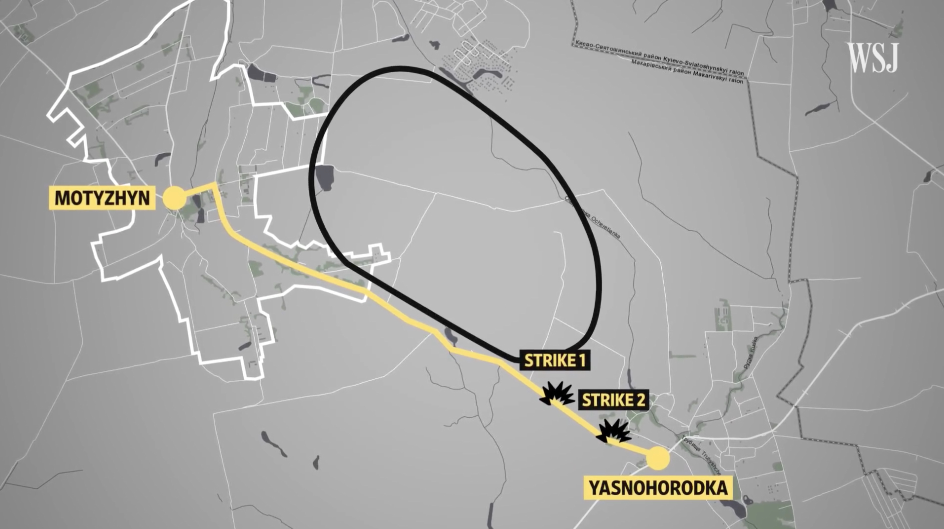 На семикілометровому відтинку дороги між селами Мотижин і Ясногородка Київської області знайдено тіла 37 цивільних людей. Розслідування оприлюднила The Wall Street Journal, журналісти якої посилаються на дані поліції, свідчення місцевих жителів і відео з автомобільних реєстраторів.