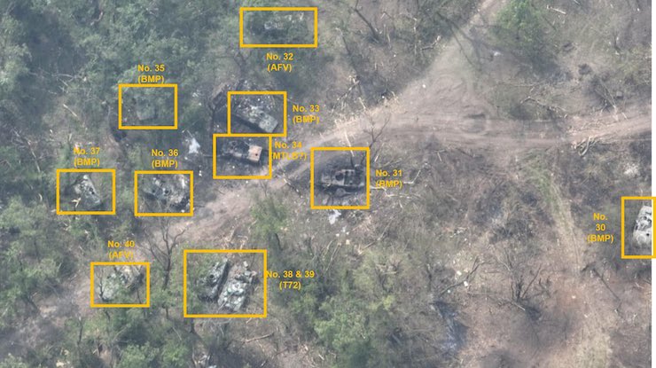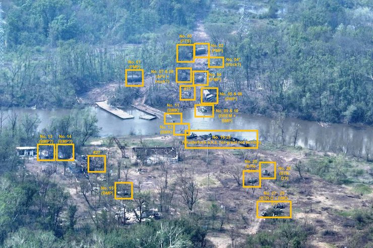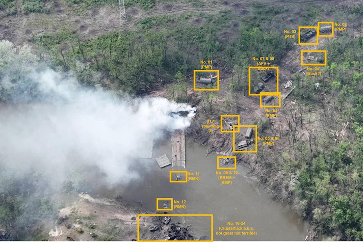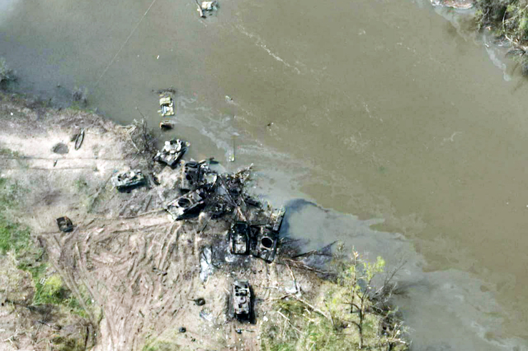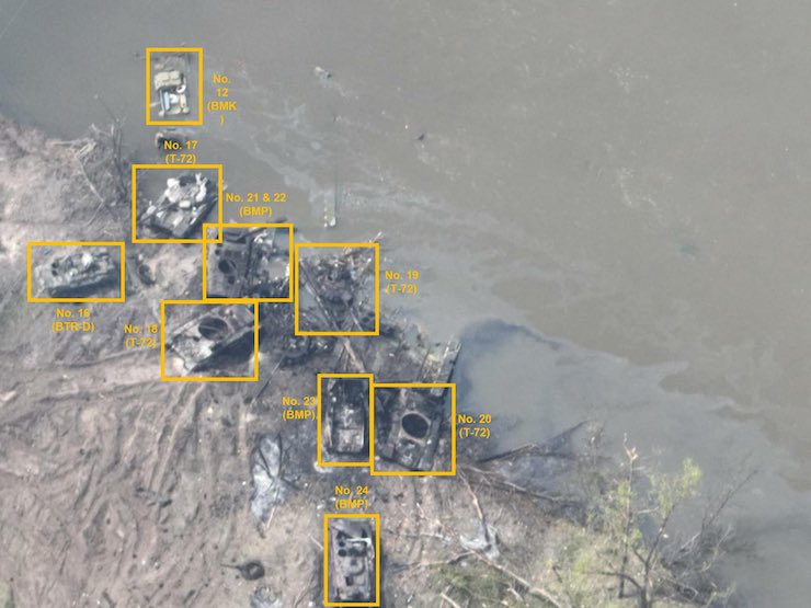 Супутникові знімки свідчать, що українські артилерія й танки зруйнували кілька збудованих росіянами понтонних мостів і понищили велику кількість техніки та живої сили.