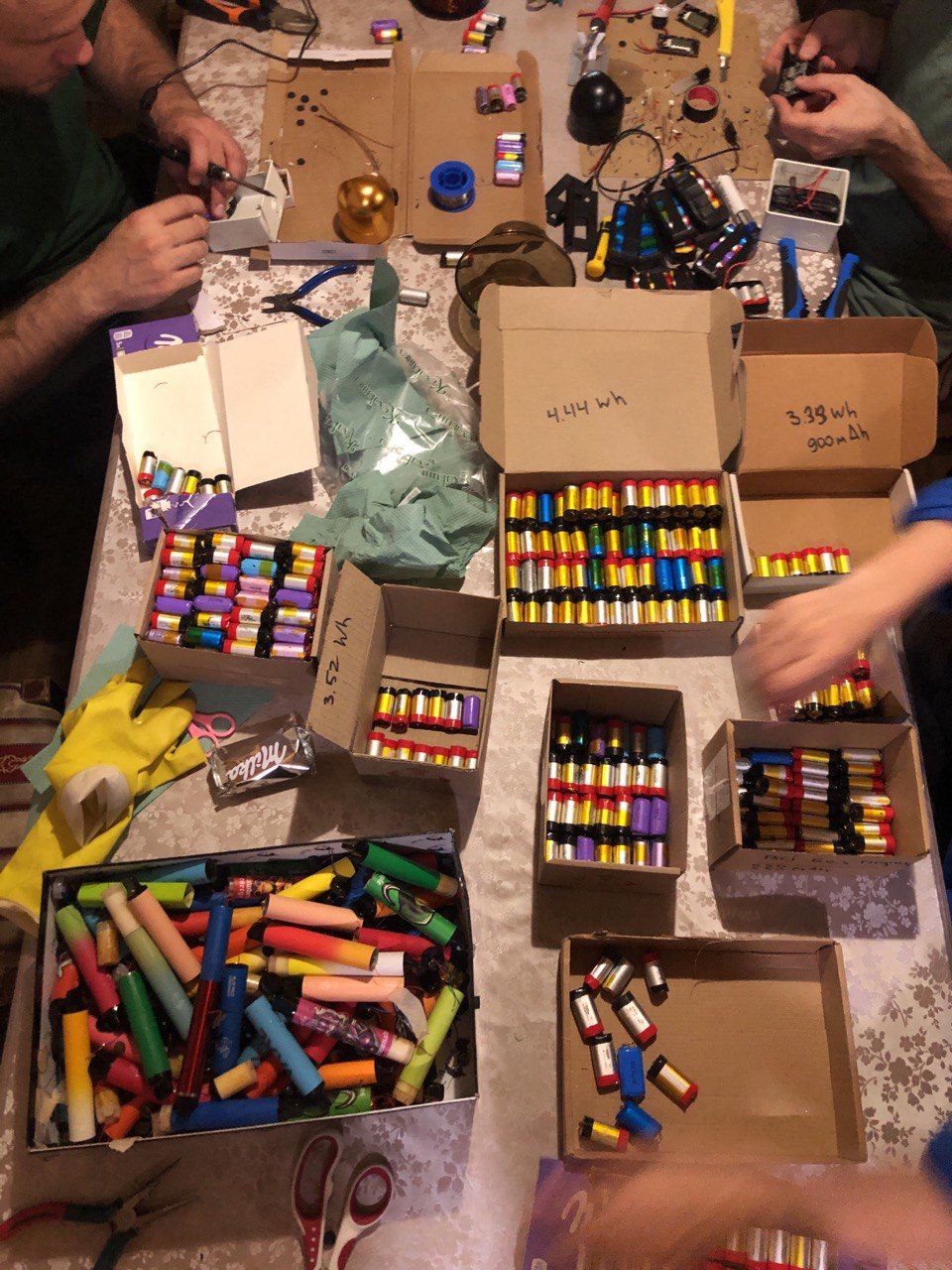 Відкривати сигарети та сортувати акумулятори айтівцям допомагають місцеві. Всі акумулятори сортують за ємністю, вагою, виробником. Відсортовані сигарети, які не підходять, відвозять до місцевого магазину електроніки, який приймає акумулятори на утилізацію. Ємність акумуляторів додатково перевіряють спецприладом. Потім акумулятори спаюють по чотири-п’ять штук, встановлюють модуль захисту.