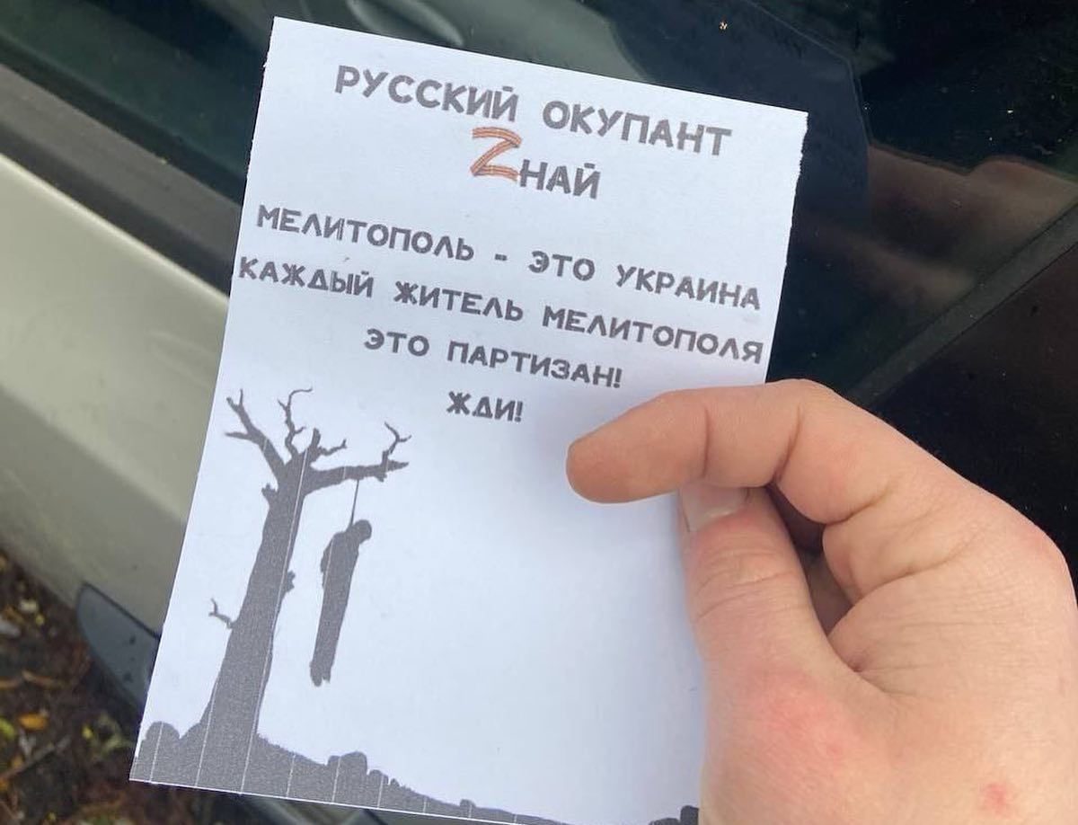 Місцева журналістка Світлана Залізецька запевняє, що 90% мелітопольців або партизанять, або чинять якийсь опір: «Одні просто з ненавистю дивляться на російських солдатів. Інші співають ночами патріотичних пісень. Деякі вивішують на вулицях плакати з українськими прапорами».