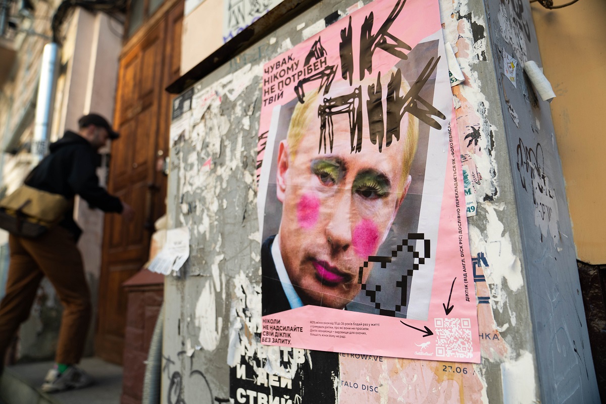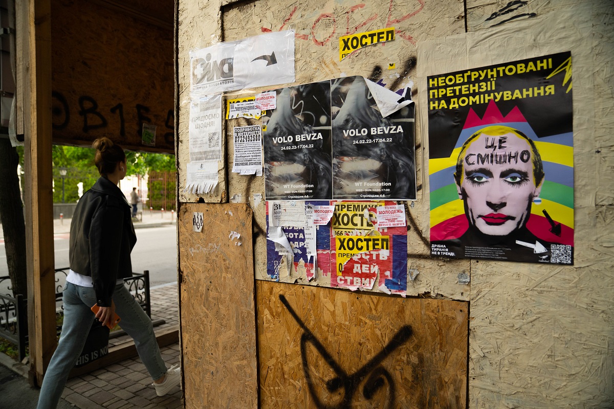 На вулицях Києва з’явилися жартівливі плакати із зображенням президента РФ Путіна, країни-агресора, що розпочала повномасштабну війну в Україні.