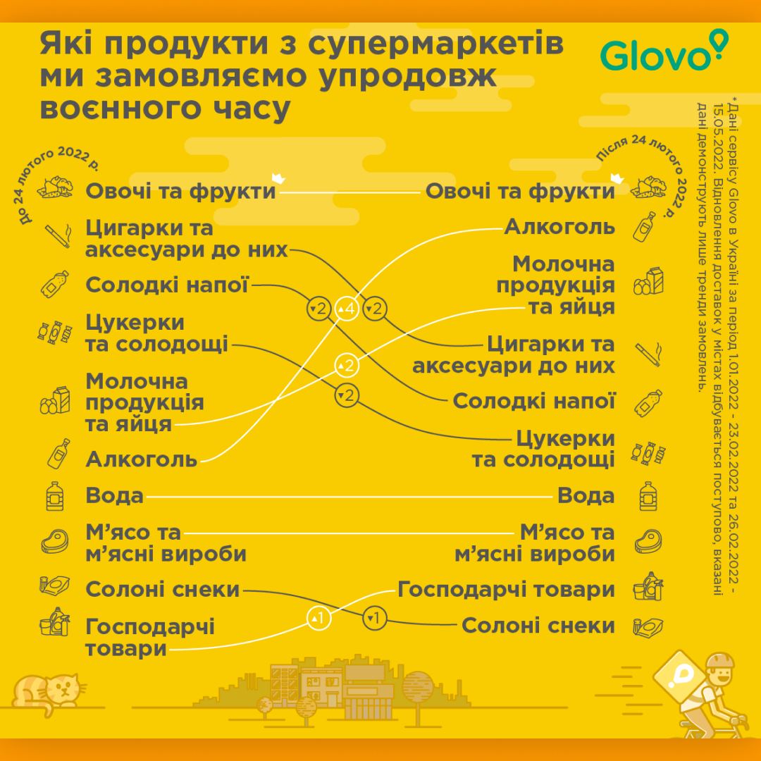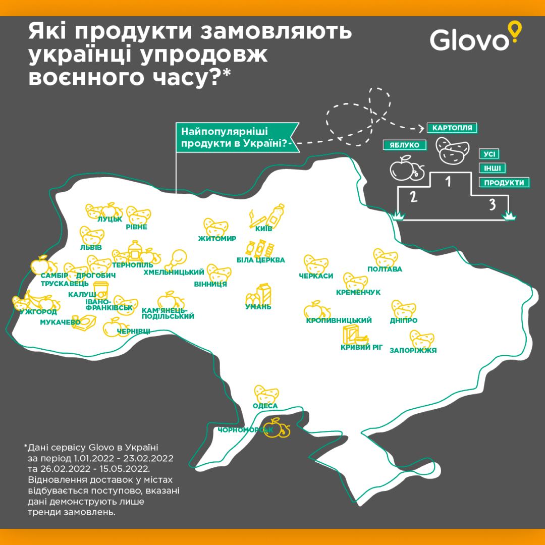 Серед найпопулярніших продуктів з супермаркетів, які замовляють українці під час війни: картопля та яблука. У Києві найчастіше замовляють солодкі напої та цигарки. Овочі та фрукти були найпопулярнішою позицією до війни і залишились після. На другому місці серед популярних замовлень після 24 лютого – алкоголь, раніше він був на шостій позиції. Також зросла популярність молочних продуктів, яєць та господарчих товарів.