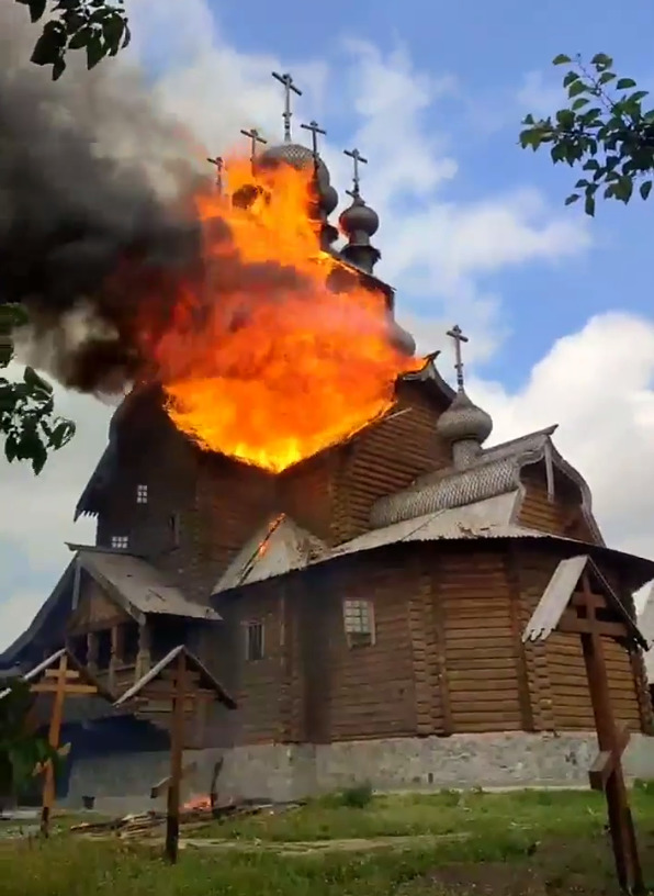 Російські війська обстріляли Святогірську лавру Московського патріархату на Донеччині. У результаті спалахнула дерев’яна будівля Всіхсвятського скиту. В УПЦ МП заявили, що масштабна пожежа охопила повністю головний храм.
