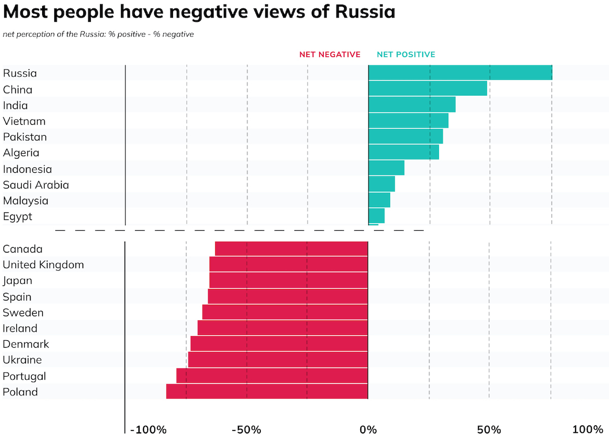 Україна також виявилася єдиною країною Європи, де переважає позитивне ставлення до Китаю (36% ставляться позитивно, 52% нейтрально, 12% негативно). Також українці виявилися лише на третьому місці за негативним ставленням до РФ, їх випередили жителі Польщі та Португалії.