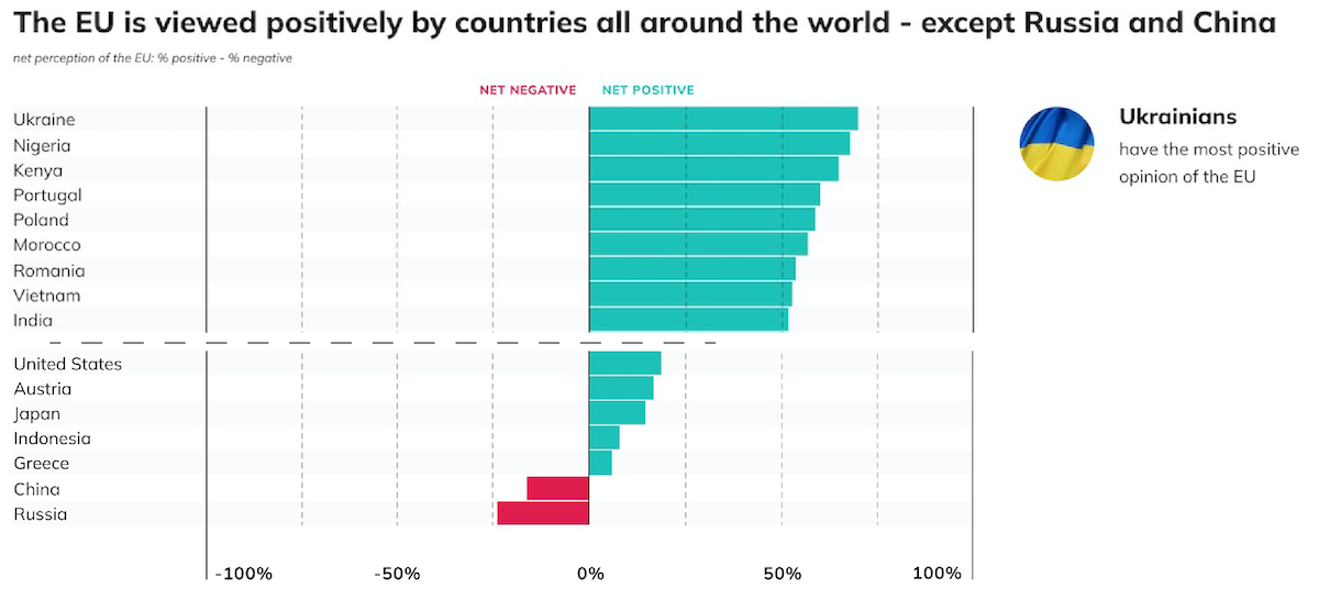 Українці сильніше за інших люблять Євросоюз. Натомість єдиними двома країнами, в яких переважає негативне ставлення до ЄС, виявилися Росія та Китай. Ці дві держави найпозитивніше ставляться одна до одної та не люблять США.