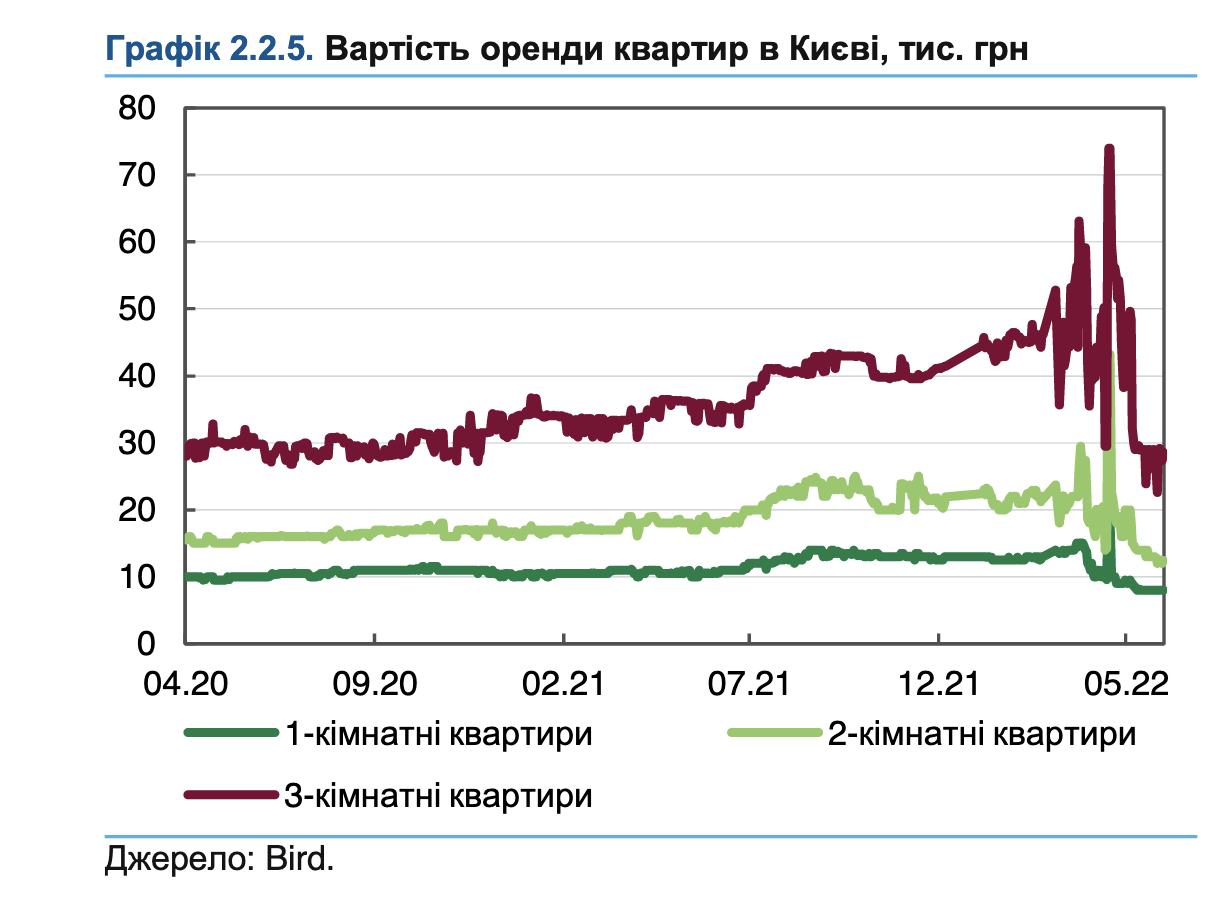 Вартість оренди помітно зменшилася, адже цей ринок швидше пристосовується до поточних умов: ціни активно реагують на зміну попиту. Попит на оренду, за даними Bird, станом на кінець травня в столиці зменшився приблизно вдвічі порівняно з довоєнним рівнем. Відповідно і ціна оренди в середньому зменшилася майже на 40%.