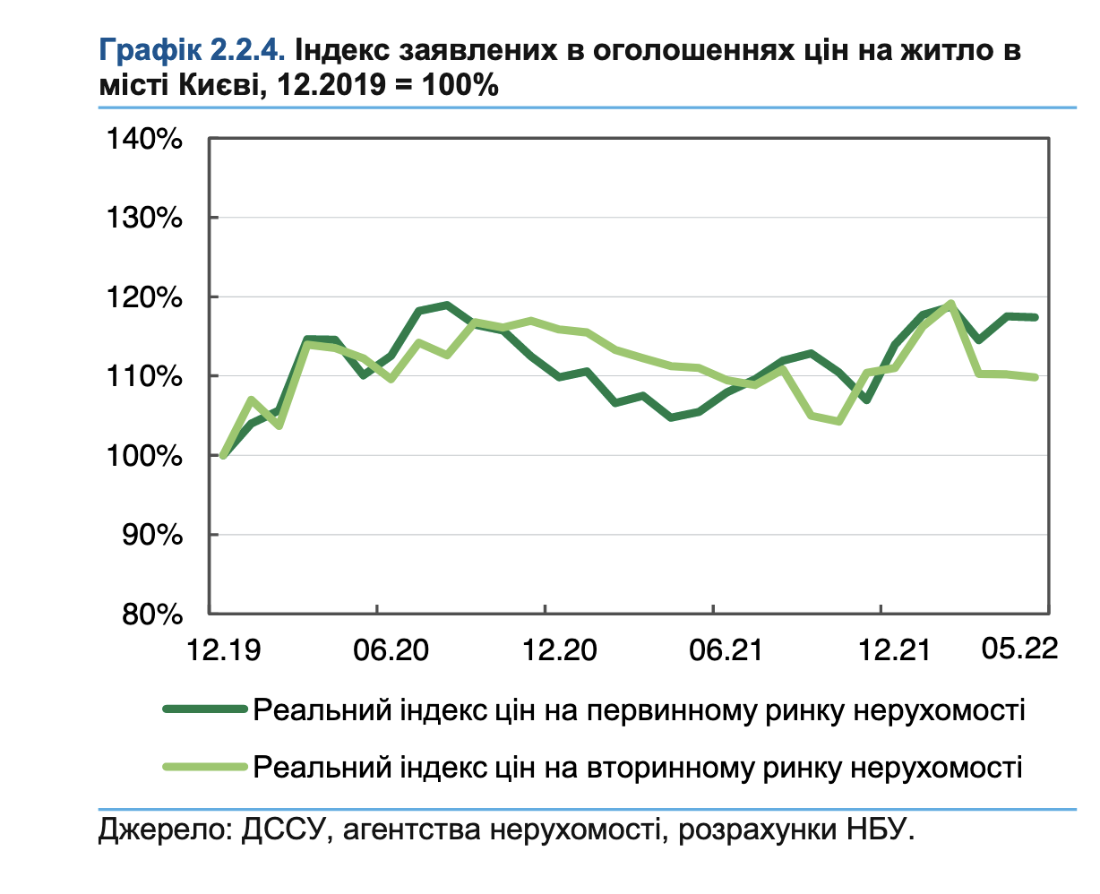 За підсумками першого місяця війни номінальні ціни на первинному ринку Києва майже не змінилися. Утім, уже у квітні, після звільнення північних областей, ситуація стабілізувалася: заявлені ціни на житло зростали в межах 5% на місяць. Експерти зазначають, що це «значно швидше, ніж за нормальних умов».