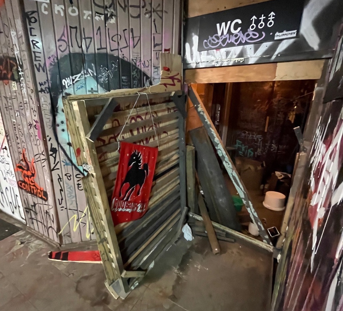 «Не виявивши жодних порушень закону, працівники МВС зламали технічну стіну в майстерню “Баня”. Знову таки не знайшовши жодних вечірок, вони зламали задні двері клубу “Отель”, де розмародерили склад гуманітарної допомоги, вкравши пару спальників, питну воду. Також намагались розбити вікно клуба Клоузер», — написав він.