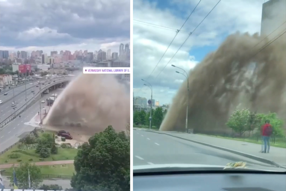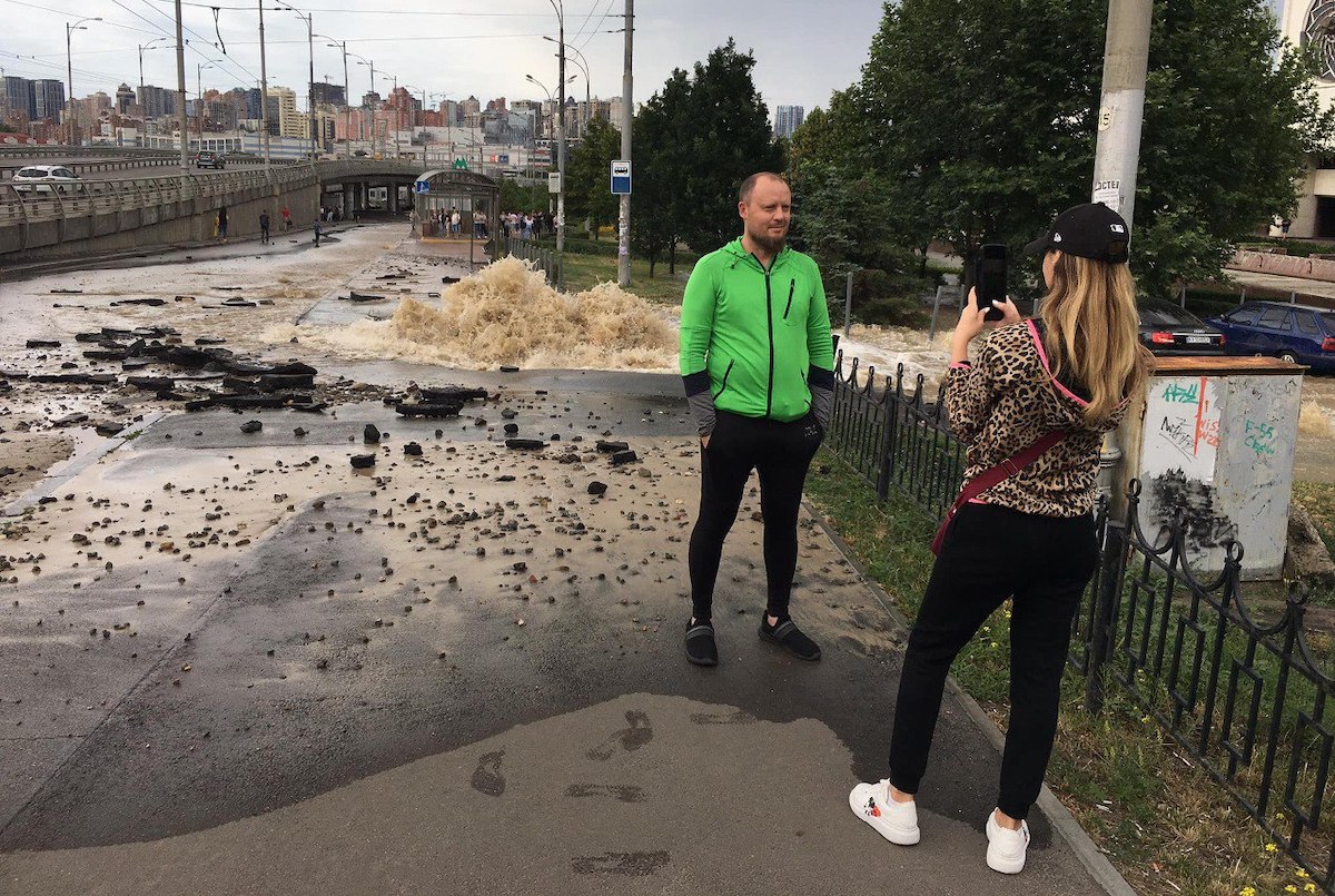 Увечері восьмого липня на Голосіївському проспекті неподалік від метро «Деміївська» в Києві прорвало трубу. Фото та відео провалля з гейзером на всю ширину тротуару опублікував журналіст Макс Юр’єв.