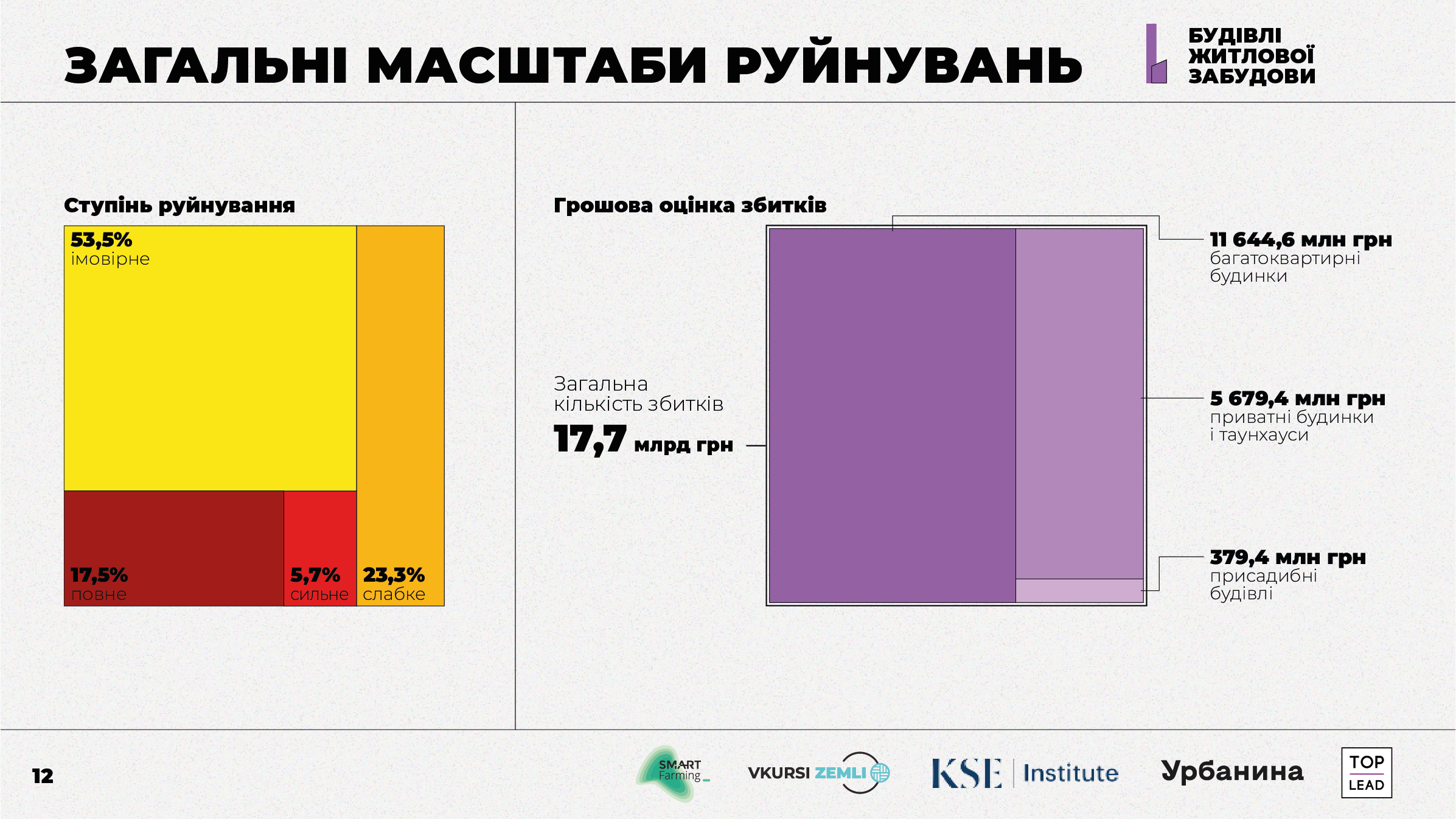 Серед житла найбільше постраждали приватні будинки та таунхауси – 1,3 млн квадратних метрів та 5,6 млрд гривень збитків на 11 738 мешканців. Серед багатоквартирних будинків через вторгнення РФ постраждали споруди висотою понад 10 поверхів загальною площею 976 800 квадратних метрів.
