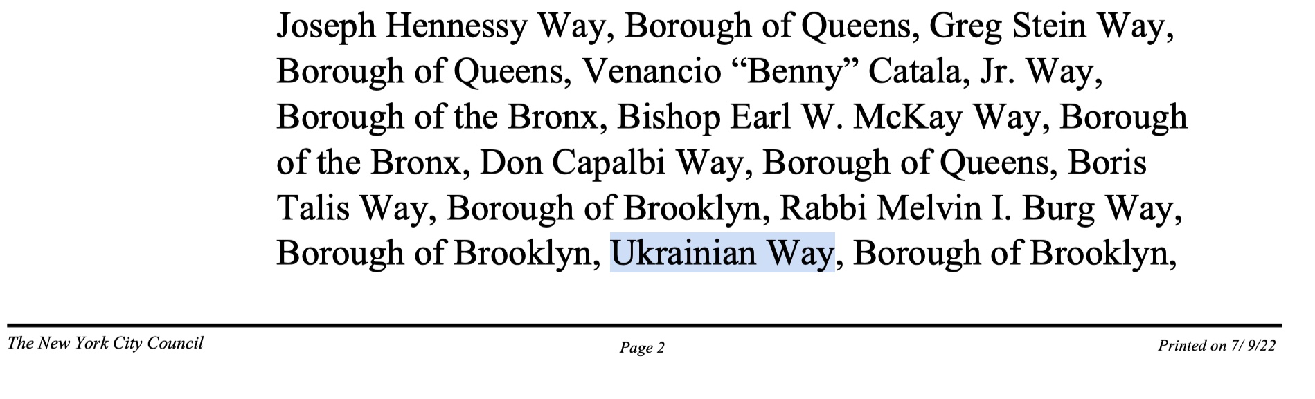 Міська рада Нью-Йорка погодила перейменування проспекту в районі Брайтон-Біч на Український шлях (Ukrainian Way). Про це повідомив представник України при ООН Сергій Кислиця, відповідне рішення також можна знайти на сайті нью-йоркської ради.