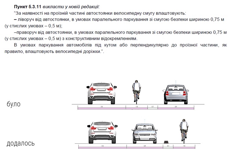 Конструктивне відмежування велосмуги гумовими або пластиковими бортами передбачено праворуч від смуги паркування. Оновлена ДБН В.2.3-5:2018 «Вулиці та дороги населених пунктів» набуде чинності першого вересня.