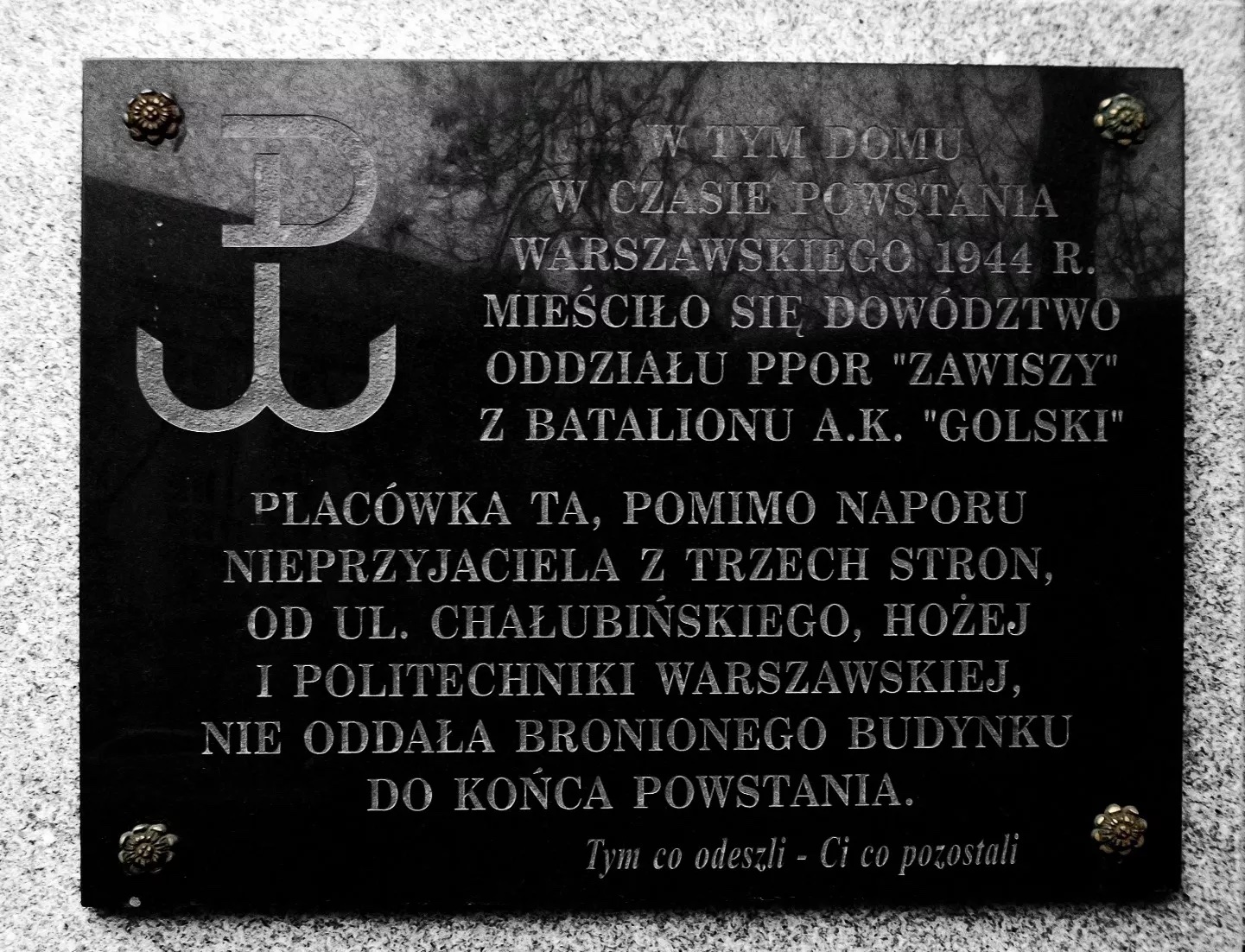 Під час окупації у будинку було розташовано склад хімікатів для виготовлення гранат, який гітлерівцям так і не вдалося виявити. 63 дні кам’яницю запекло обороняли повстанці, про що свідчить табличка на фасаді.