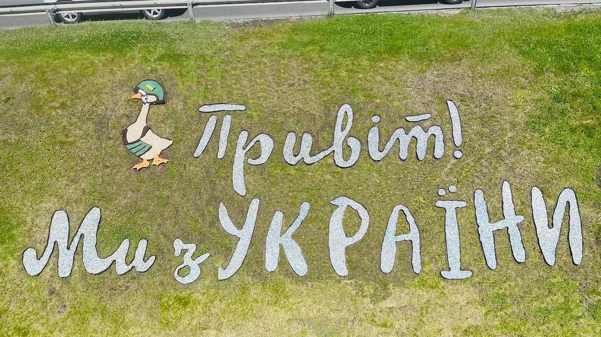 Комунальники нагадують, що це вже другий «бойовий гусак» у Дніпровському районі. Першого було створено на схилі транспортної розв’язки біля метро Лівобережна, на початку червня з фразою «Привіт! Ми з України».