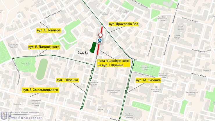 У Києві після закінчення капітального ремонту на вулиці Івана Франка запроваджено нову організацію дорожнього руху. Ділянка з вулиці Ярославів Вал на вулицю Франка і в зворотньому напрямку стала пішохідною зоною, повідомляє Київавтодор.