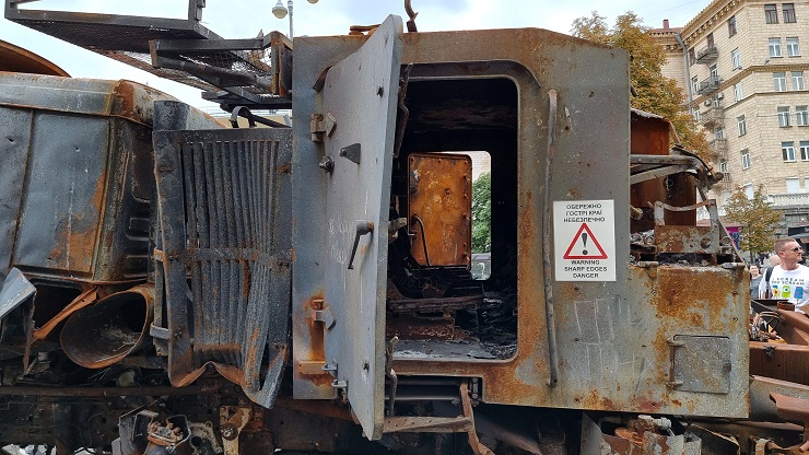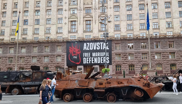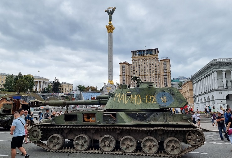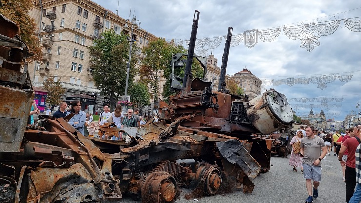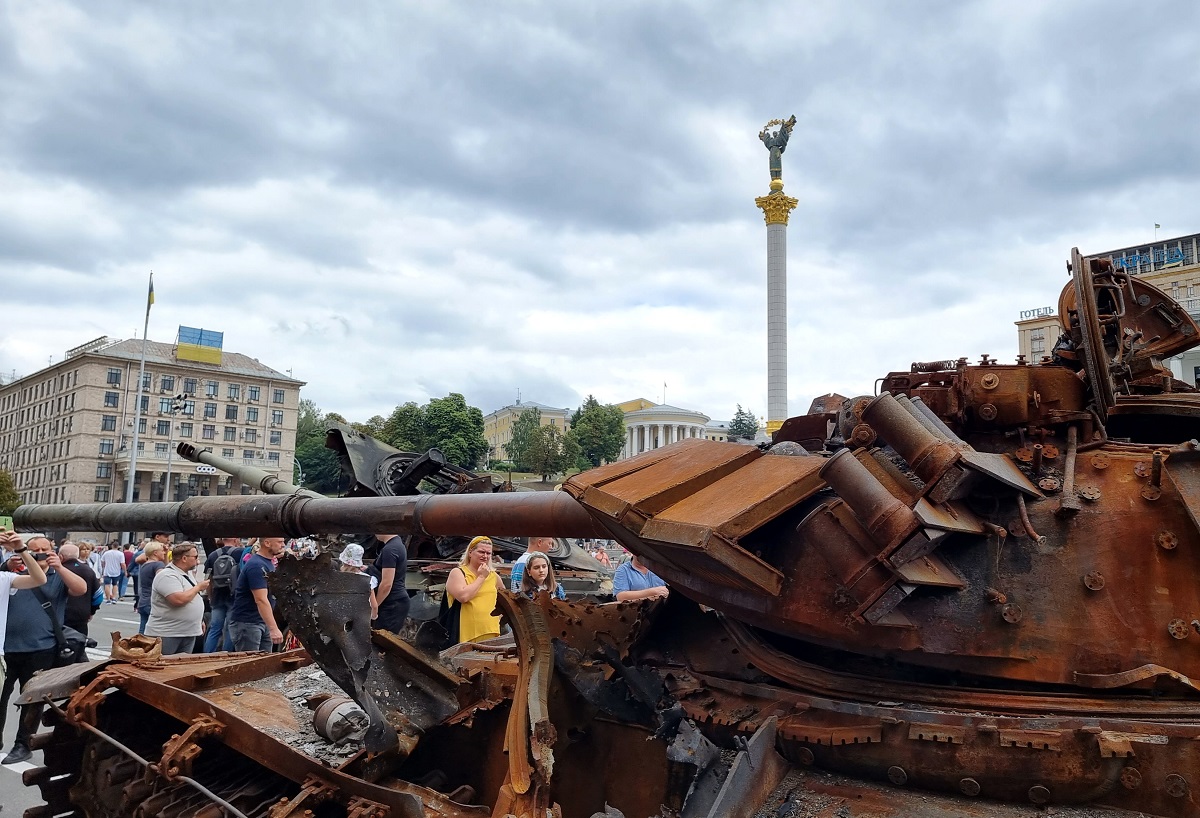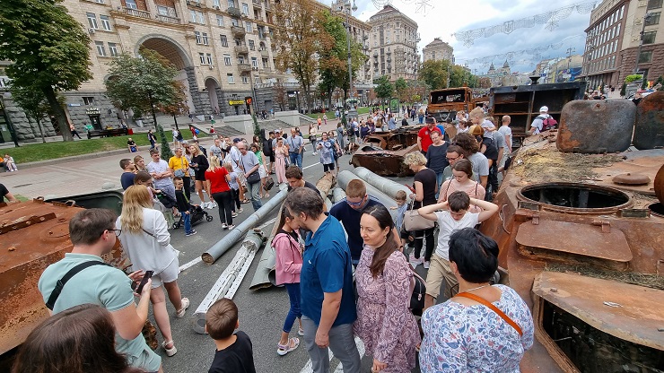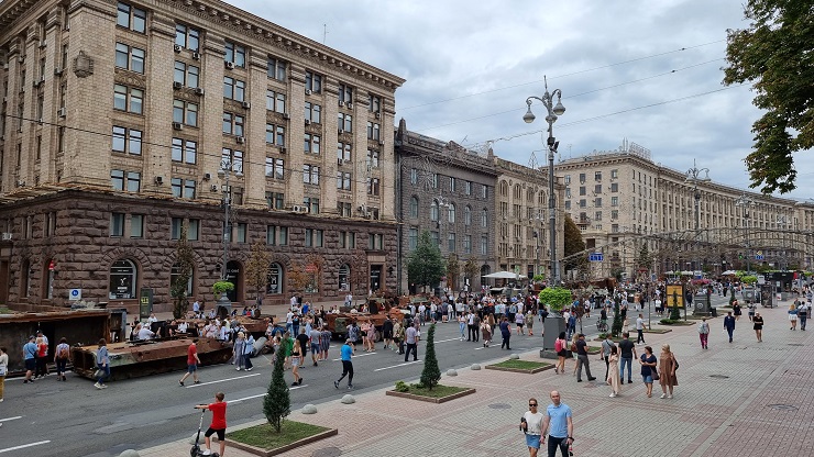 Вулиця Хрещатик перекрита, тому в центрі утворилися затори. На головній вулиці прогулюються люди повз знищену, вже іржаву російську техніку.