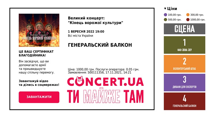 На сайті оператора можна придбати квиток на подію «Великий концерт: кінець ворожої культури». Даний захід фактично не проводиться, натомість квиток надає право лише на отримання створеного організатором відеоролику, автором якого значиться Степан Бандера.